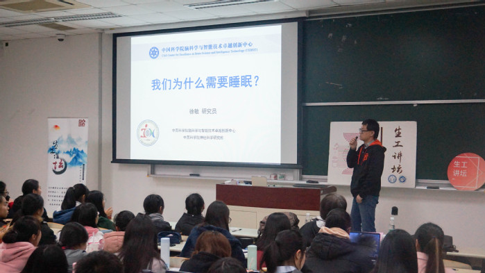 整个讲座分为五个版块:睡眠是生存的必需条件、睡眠的功能、现代睡眠的研究起源、睡眠与疾病和睡眠的影响因素。“我们为什么需要睡眠?”徐敏研究员以此问句开启讲座,引发在场同学思考。他首先用“连熬11个“欧夜”后他一睡不醒”的震惊新闻和动物们“奇葩”的睡觉方式等生动实例作为引子,指出睡眠是生物生存的必需条件。接着他播放了对小鼠脑部信号检测的视频,使同学们了解到睡眠与学习记忆息息相关。说到现代睡眠的研究起源,徐敏研究员提到REM Sleep(快速眼动睡眠)这一专业名词的命名与其行为的发现,并用数据和图表清晰地阐明了几种熟睡程度的区分。他还向同学们介绍了与睡眠相关的两个病症:“嗜睡症”和RBD(快速眼动睡眠行为障碍)。徐敏研究员提醒大家日常生活中要多关注这两种病症,及时发现及时就医。最后,他强调了睡眠的节律调节和睡眠稳态,提出作息时间要规律的建议,希望我们睡前保持卧室光线柔和,避免手机、电脑等强光照射。