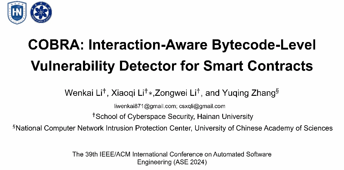 国际顶级学术会议ASE(IEEE/ACM International Conference on Automated Software Engineering)在10月27日起在美国加州萨克拉门托召开。best365官网博士研究生李文凯(第一作者)、副教授李晓琦(通讯作者)、特聘教授张玉清、硕士生李宗维在ASE上发表长篇Regular Research论文“COBRA: Interaction-Aware Bytecode-Level Vulnerability Detector for Smart Contracts”。ASE属于CCF A类学术会议,是软件工程研究领域的国际顶级学术会议。