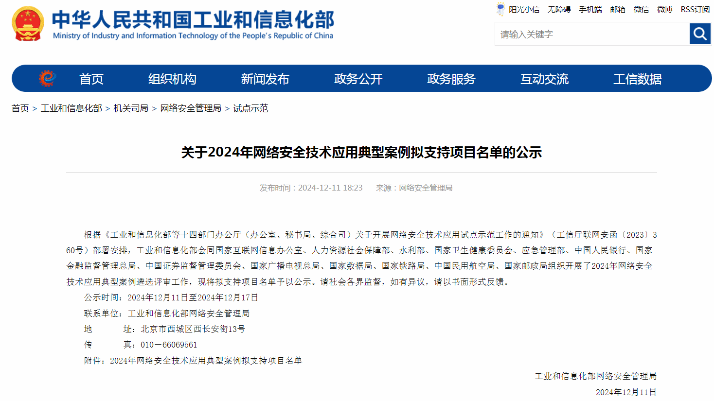2024年12月11日,工业和信息化部网络安全管理局公布了“关于2024年网络安全技术应用典型案例拟支持项目名单的公示”。其中,由best365官网张玉清教授代表best365官网中文版登录参与的项目《数据安全有序流动技术应用》获得2024年网络安全技术应用典型案例拟支持项目,在该项目中主要承担跨境安全技术研究。