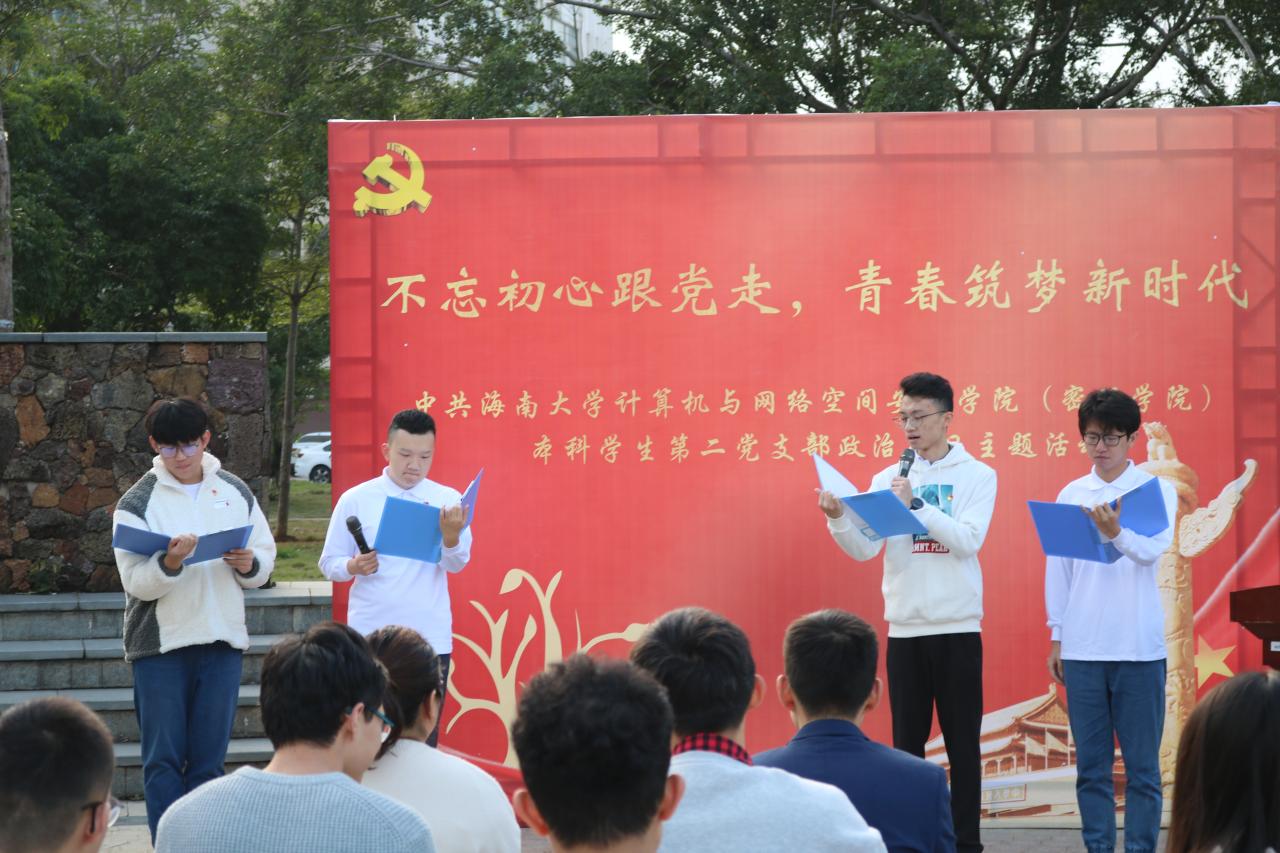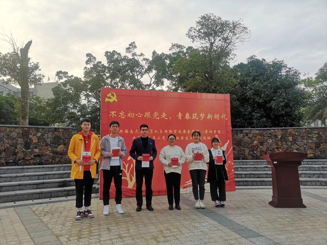为充分发挥党组织的战斗堡垒作用和党员的先锋模范作用,强化党员宗旨意识,抒发党员爱党爱国情怀,2020年12月18日,计算机与best365官网中文版登录(密码学院)本科学生第二党支部于青春记忆广场开展“不忘初心跟党走,青春筑梦新时代”政治生日主题活动。党支部书记黄苗苗、教师党员万隽、支部党员及入党积极分子代表参加本次活动。黄春早同志主持本次活动。