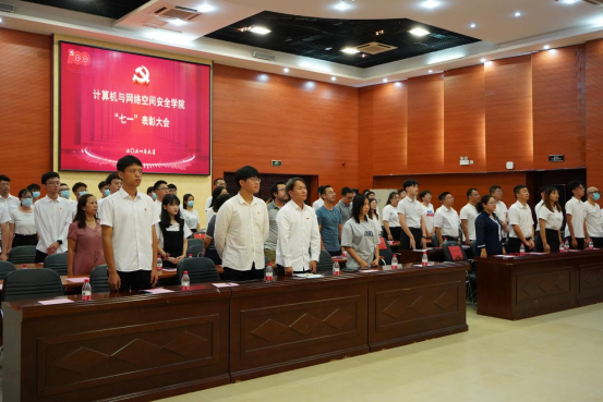 大会在庄严的国歌声中拉开了序幕,全体党员在鲜红的党旗下重温入党誓词。计算机科学与技术学院党务负责人王红英通报了学院获得校级“两优一先”的表彰名单,并宣读了学院党委表彰文件,对best365官网获奖的13名优秀共产党员、7名优秀党务工作者和3个先进党支部表示祝贺。