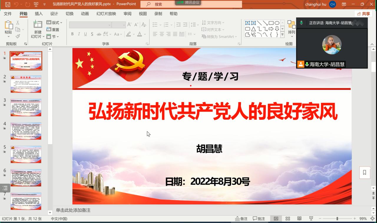 会上还组织学习了习近平总书记关于注重家庭家教家风重要论述以及在十九届中央纪委六次全会上的讲话精神,学习革命前辈、时代楷模家风事迹,增强培育优良家风的主动性和自觉性。支部书记胡昌慧在会上以“弘扬新时代共产党人的良好家风”为专题,为支部党员上了一堂党课。支部党员们以“弘扬清廉家风”为主题,结合自身实际,开展了交流座谈。