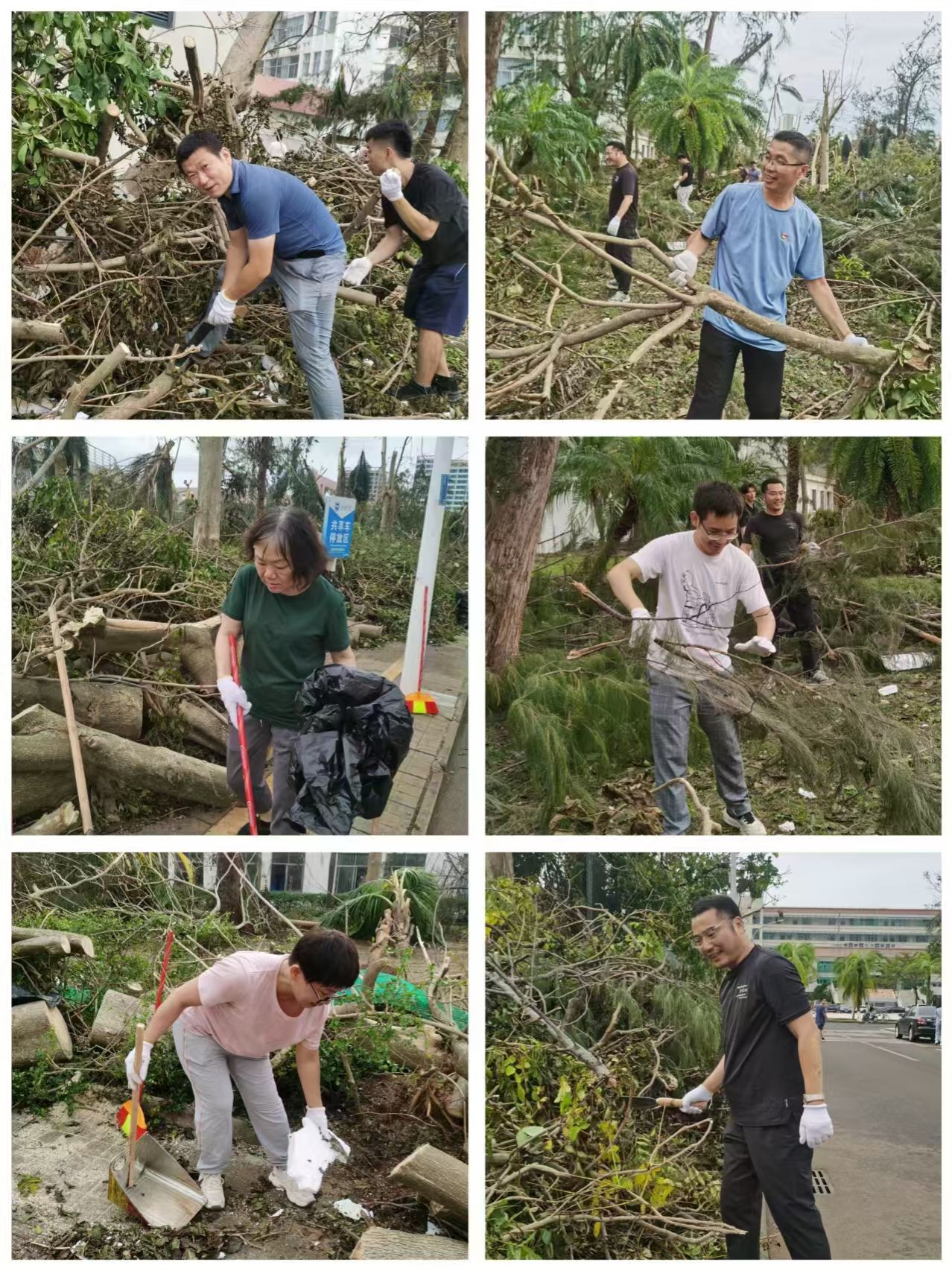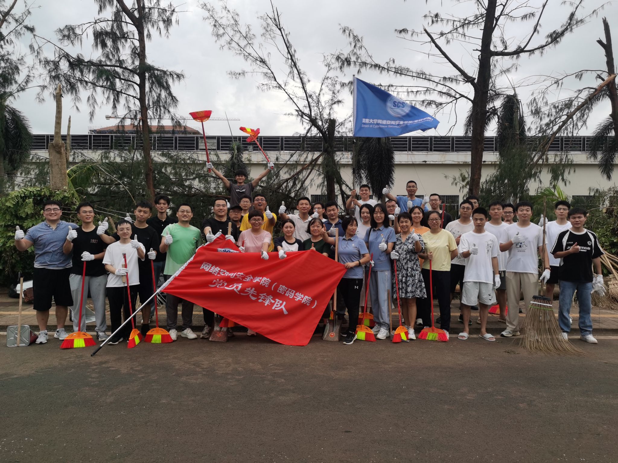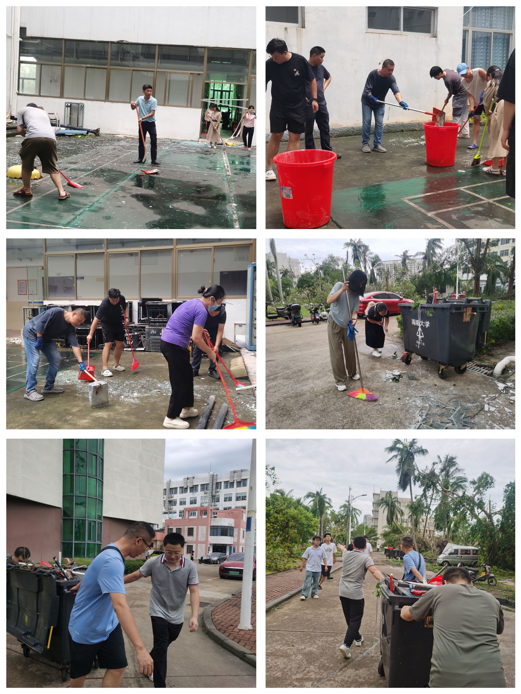 在领导小组的指挥下,党员先锋队冲锋在前,力除台风造成的安全隐患。师生志愿者分成4个小组,有序投入灾后恢复工作。