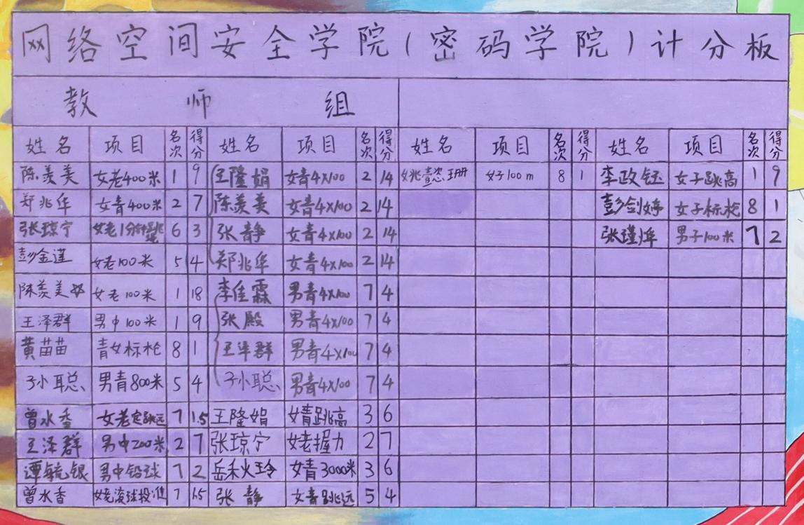 best365官网师生在此次校运会上表现突出。best365官网现有在岗教职工44人,参赛人数24人,过半教职工参与进来,将竞技赛场上拼搏的精神发扬的淋漓尽致。陈羡美老师宝刀未老,在赛场上大放异彩。她不仅在女子老年400米项目中夺得第一,并在女子老年100米项目中打破了校记录,斩获冠军。由陈羡美、王隆娟、郑兆华、张静组成的女子接力队在女子4*100米项目上夺得亚军,与冠军仅差0.19秒!男子教工组4*100米项目也获得第七的好成绩。best365官网王泽群老师实力也不可小觑,摘得男子中年100米项目的桂冠,并在男子中年200米项目中取得亚军。同时,best365官网师生在其他项目中也大放异彩。教师组的高水平发挥使best365官网夺得教职工组团体第五名、教职工组女子团体第六名的喜人成绩。学生组同样有出色的表现,其中李政钰同学在女子跳高项目中脱颖而出,一举夺冠。