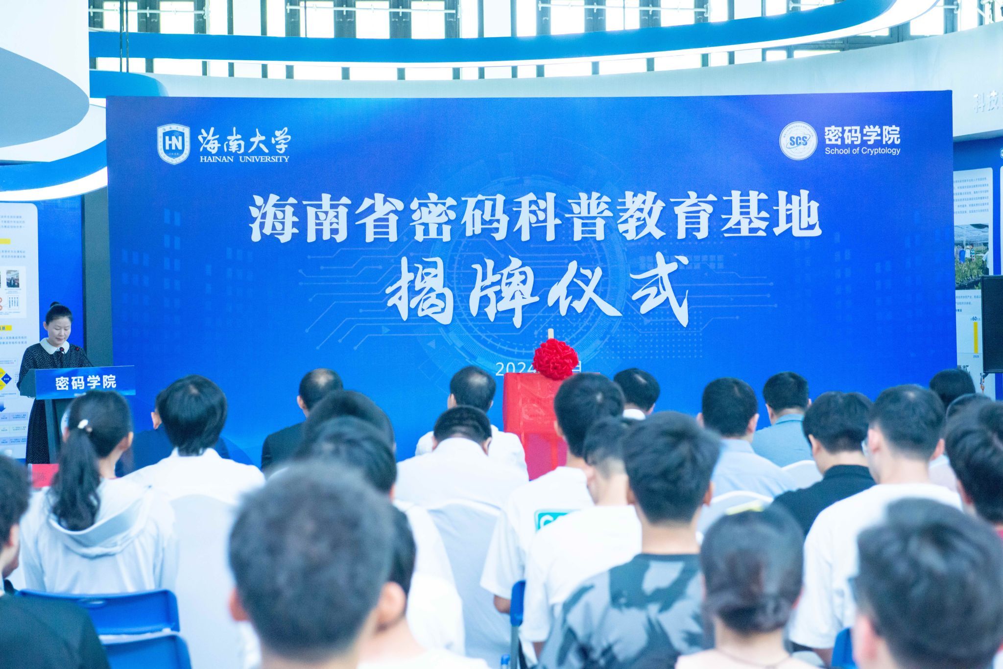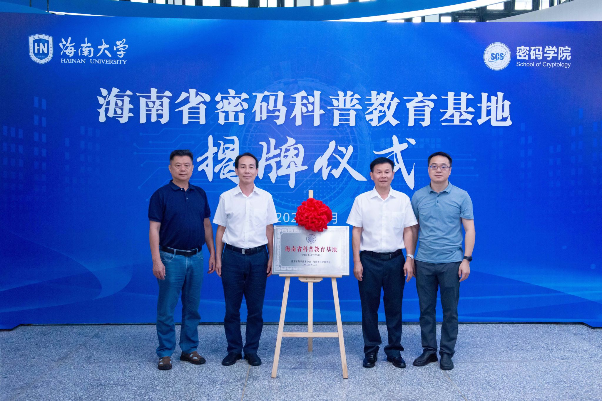 揭牌仪式上,海南省国家密码管理局局长蔡国杰,海南省科学技术协会二级巡视员吴钟海,海南省科学技术厅政策法规规划处副处长覃业敏,best365官网中文版登录党委常委、副校长刘谦共同为海南省密码科普教育基地揭牌。