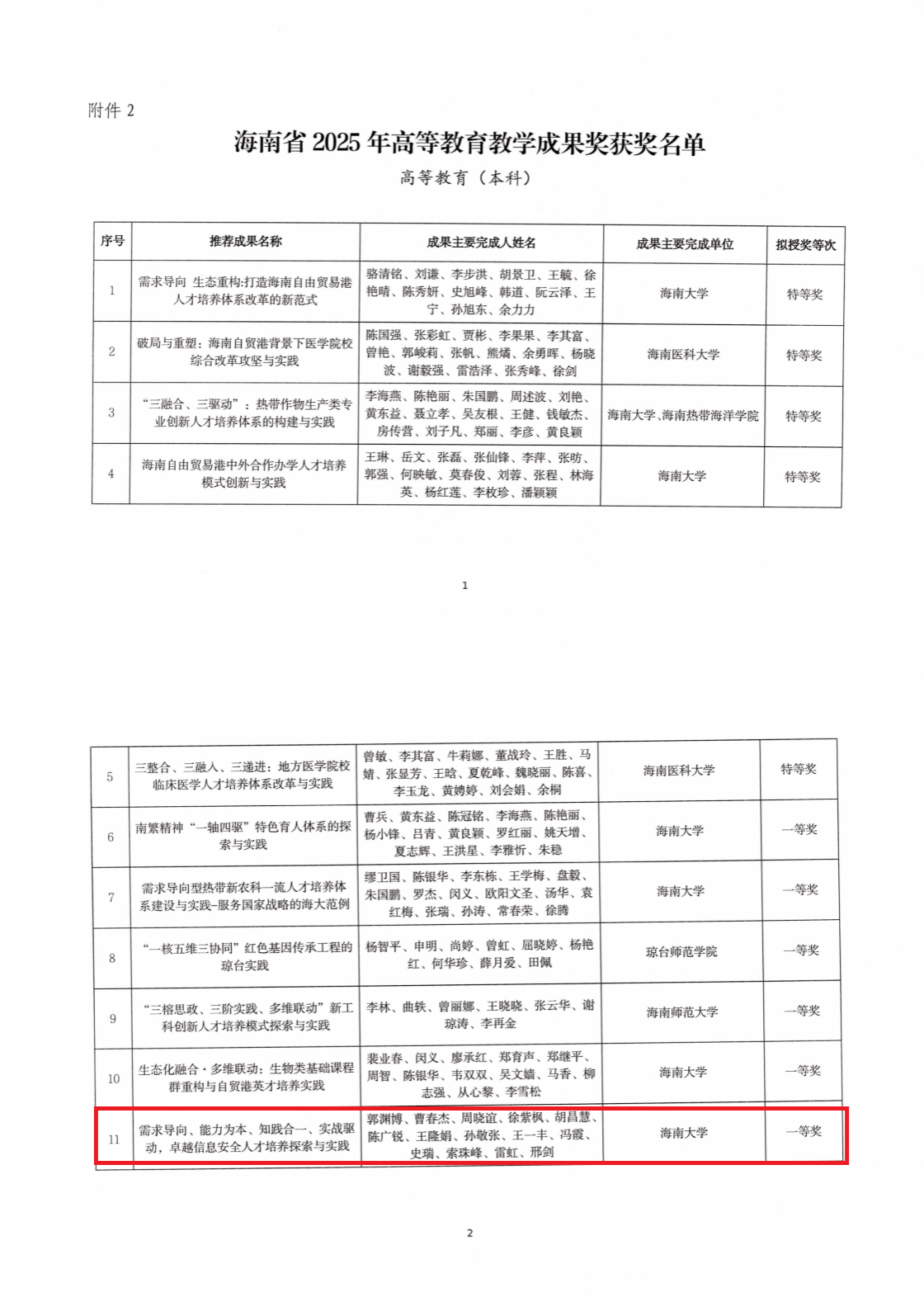 近日,海南省教育厅公布2025年海南省教学成果奖评选结果,best365官网申报的教学成果“需求导向、能力为本、知践合一、实战驱动,卓越信息安全人才培养探索与实践”荣获高等教育教学成果奖(本科组)一等奖。该成果以鲜明的育人特色、系统的培养体系和突出的实践成效,彰显了学院在信息安全与密码领域人才培养方面的领先水平,有力支撑了国家网络强国战略和海南自贸港建设对高层次、实战型信息安全人才的需求。